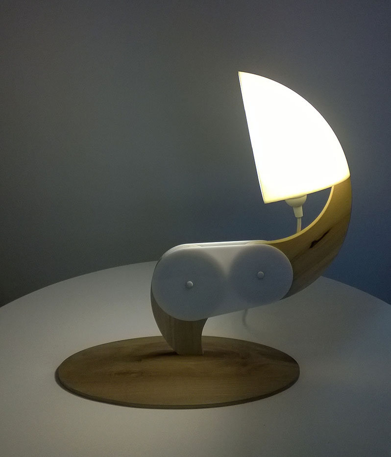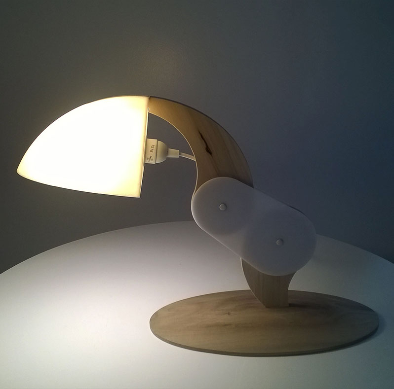 The lamp base and arms are milled out of poplar by means of CNC. The lamp “hinges” are laser cut from acrylic. Chipboard “washers” are spray mounted to the interior of the acrylic components to create greater friction.