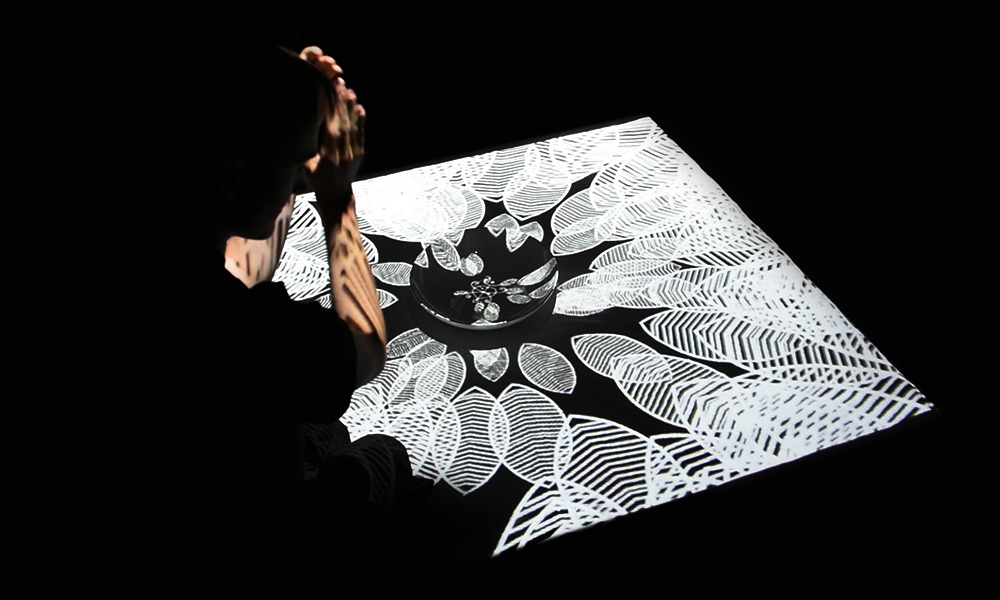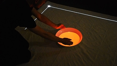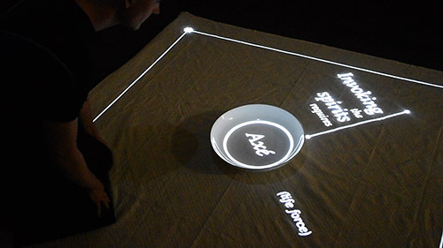 The interaction model of this installation was inspired by the ceremonial format of a traditional sacrificial right. The ritual is structured in three stages. In the first phase the worshiper crosses the ceremonial threshold to enter the sacred space. In the second stage offers a sacrifice to the deity. The final phase consists of an invocation to being the sprits into the sacred space, entrancing the worshiper.